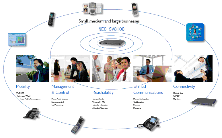 配置了一个SV8100系统,您能够布置一个纯IP的解决方案。他既支持VOIP,同时也支持传统的TDM技术。